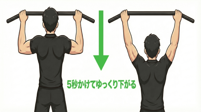 ネガティブ懸垂は、自力で身体を持ち上げられない人が、最短で懸垂をマスターするための「裏ワザ」的なトレーニングです。通常の懸垂とは逆の手順で、「下りる動作」だけを集中して行います。