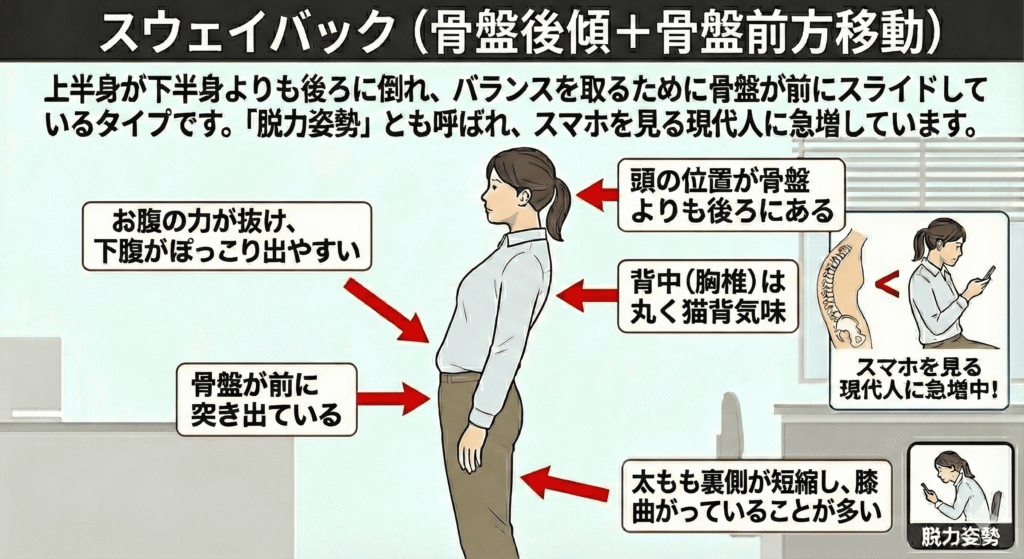 上半身が下半身よりも後ろに倒れ、バランスを取るために骨盤が前にスライドしているタイプです。「脱力姿勢」とも呼ばれ、スマホを見る現代人に急増しています。