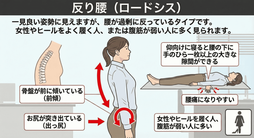一見良い姿勢に見えますが、腰が過剰に反っているタイプです。女性やヒールをよく履く人、または腹筋が弱い人に多く見られます。