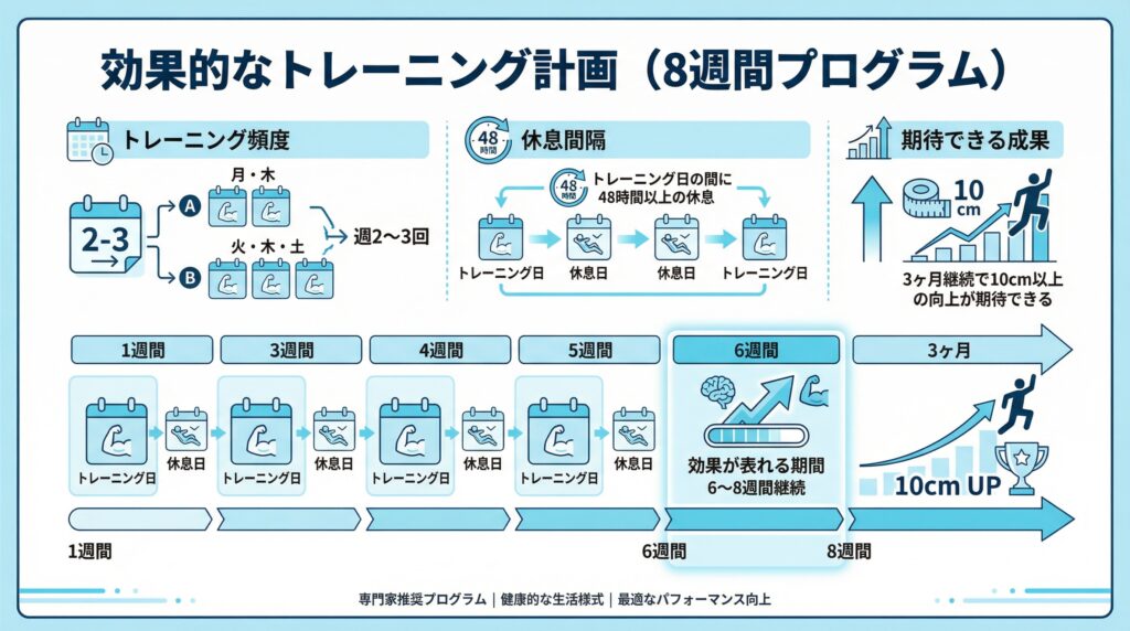 ジャンプ力向上トレーニングは、週2〜3回の頻度で行うのが最適です。